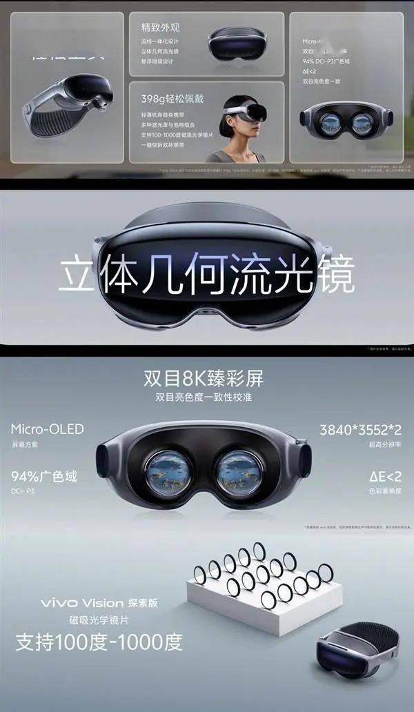 据悉,vivo Vision探索版的最大看点之一是轻便,这款头显重量压缩至398g,是目前行业内最轻的MR头显。作为对比,苹果Vision Pro的重量超过了600g。