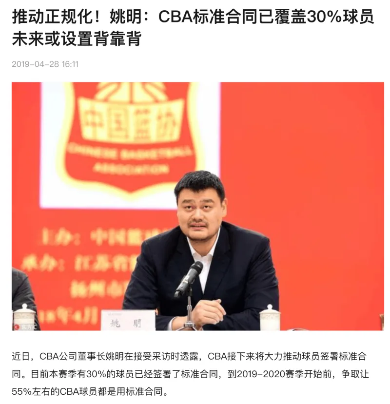 在姚明主导之下,2018—2019赛季,CBA联赛启用了标准版《国内球员聘用合同》(试行版)(下称“标准合同”)。